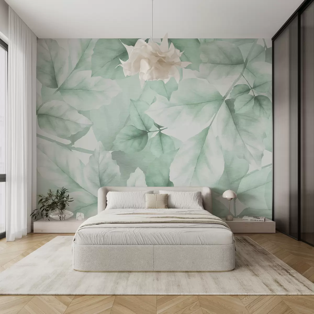 Fototapeedid Tekstuurne tapeet suurte lehtedega pastelsetes rohelistes toonides Nr w01090v3