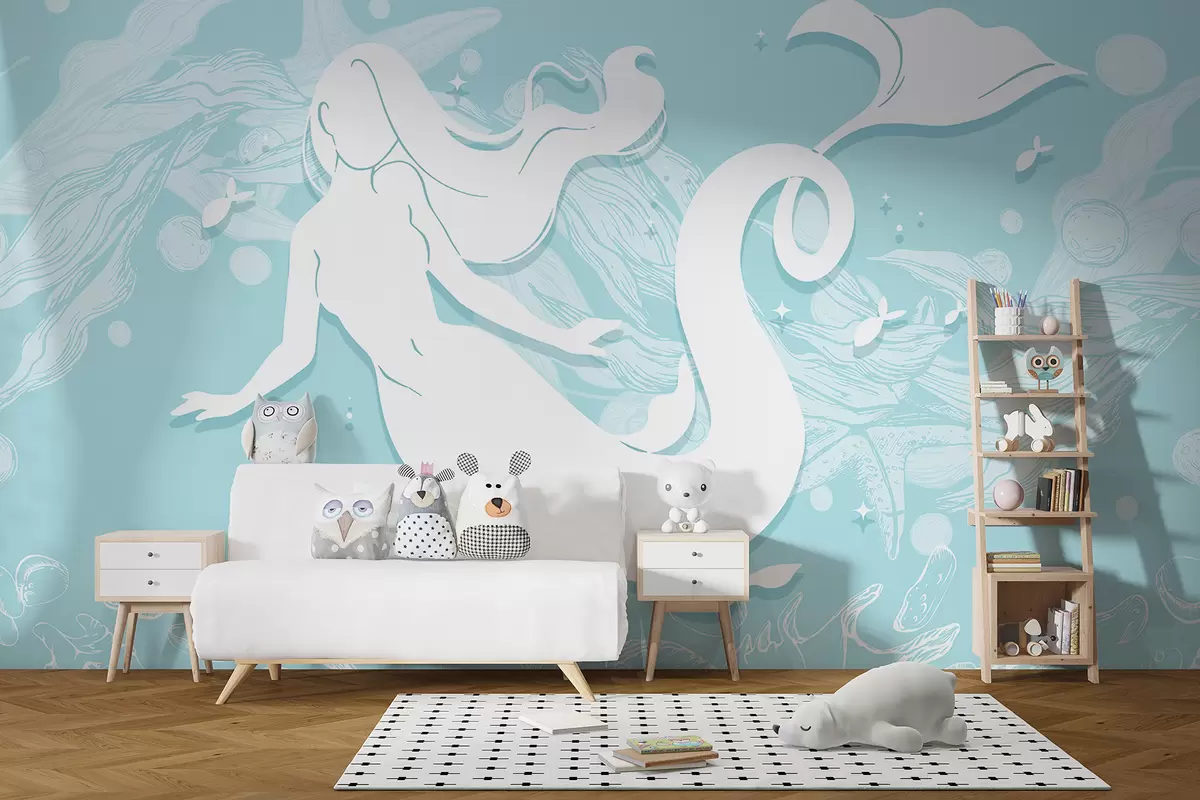Fototapeedid Valge merineitsi pikkade lendlevate juustega helesinises ookeanis ujumas valgete lainete ja mullidega Nr w01316