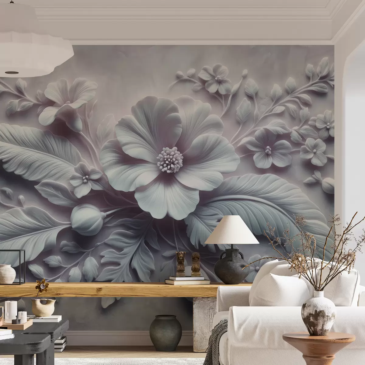 Fototapeedid 3D-reljeefne sulgede ja lilledega seinakunst suure helesinistes toonides mooniga Nr w01340v2