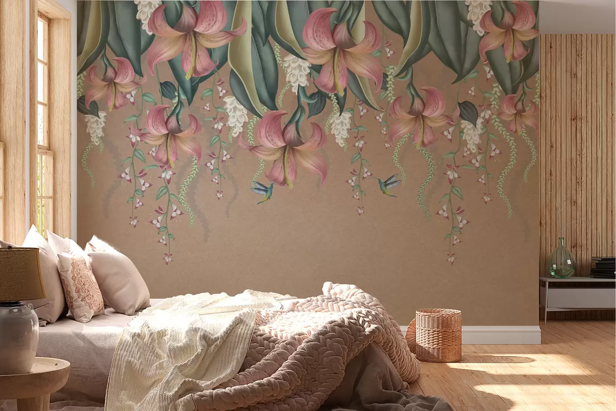 Fototapeedid Õrn botaaniline motiiv rippuvate lillide, lillede ja kolibritega grunge'i seinal Nr w01523
