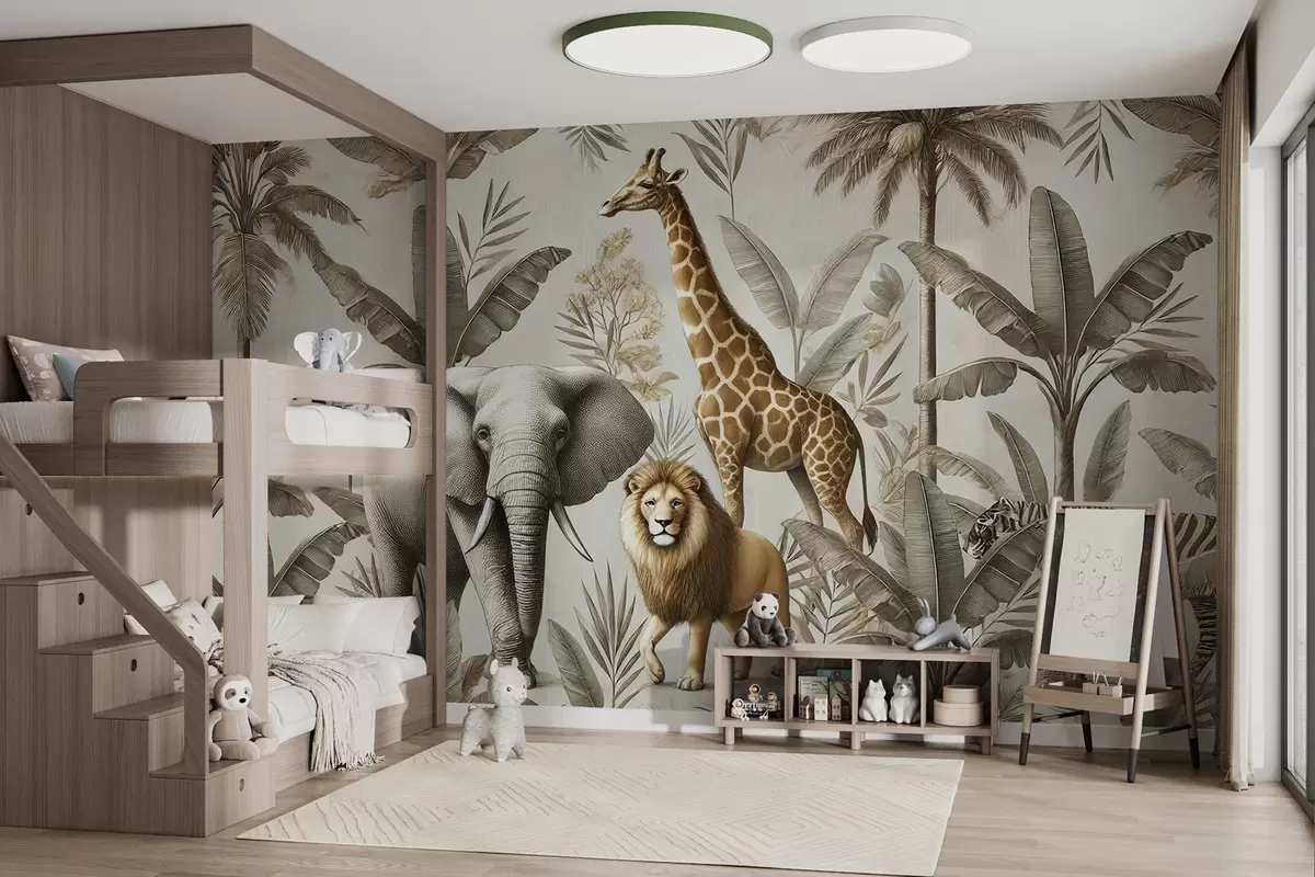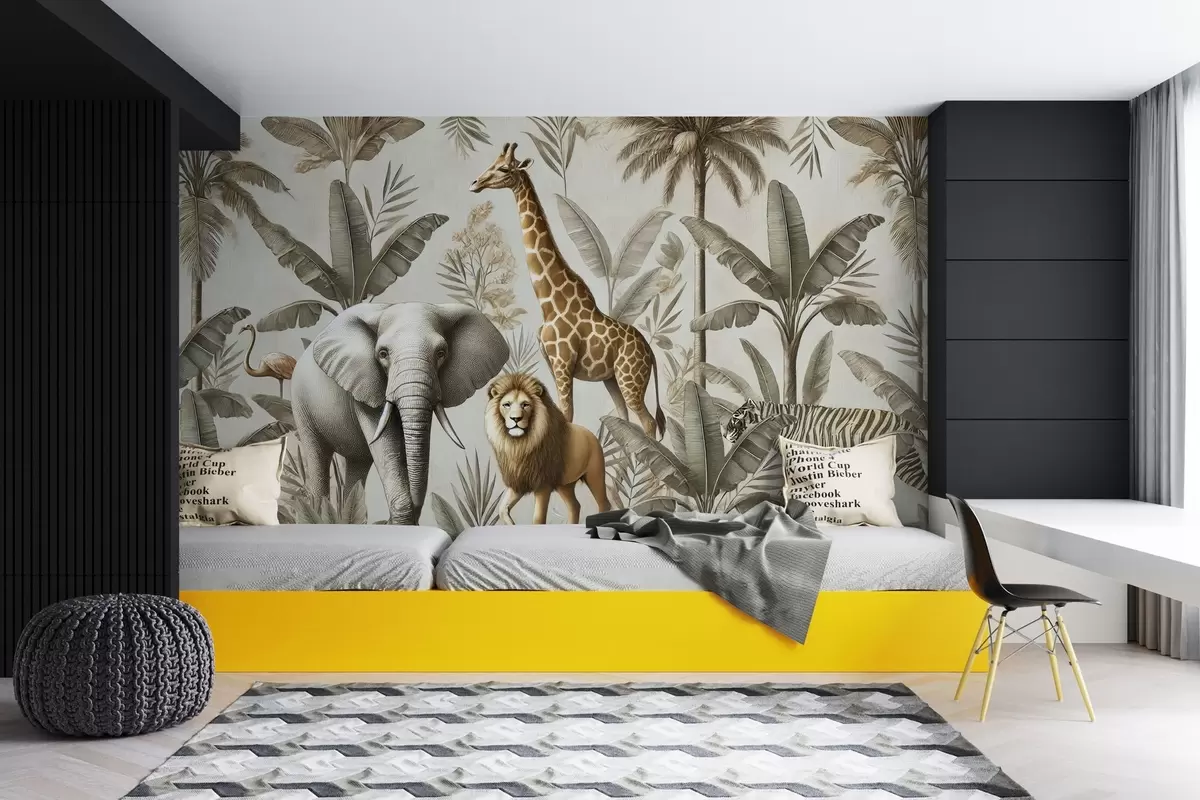 Fototapeedid Safari laste taustapilt troopilise maastiku ja erinevate loomade elegantsete värvidega Nr w01956