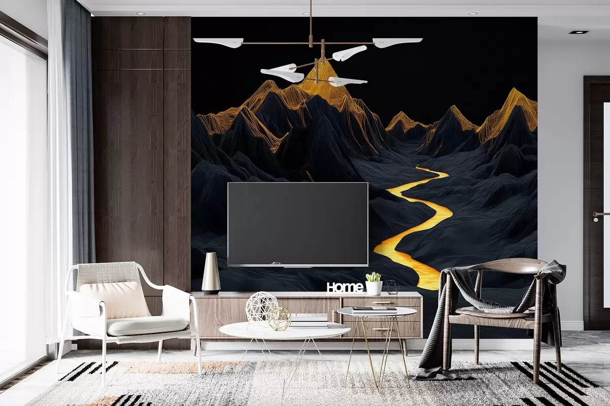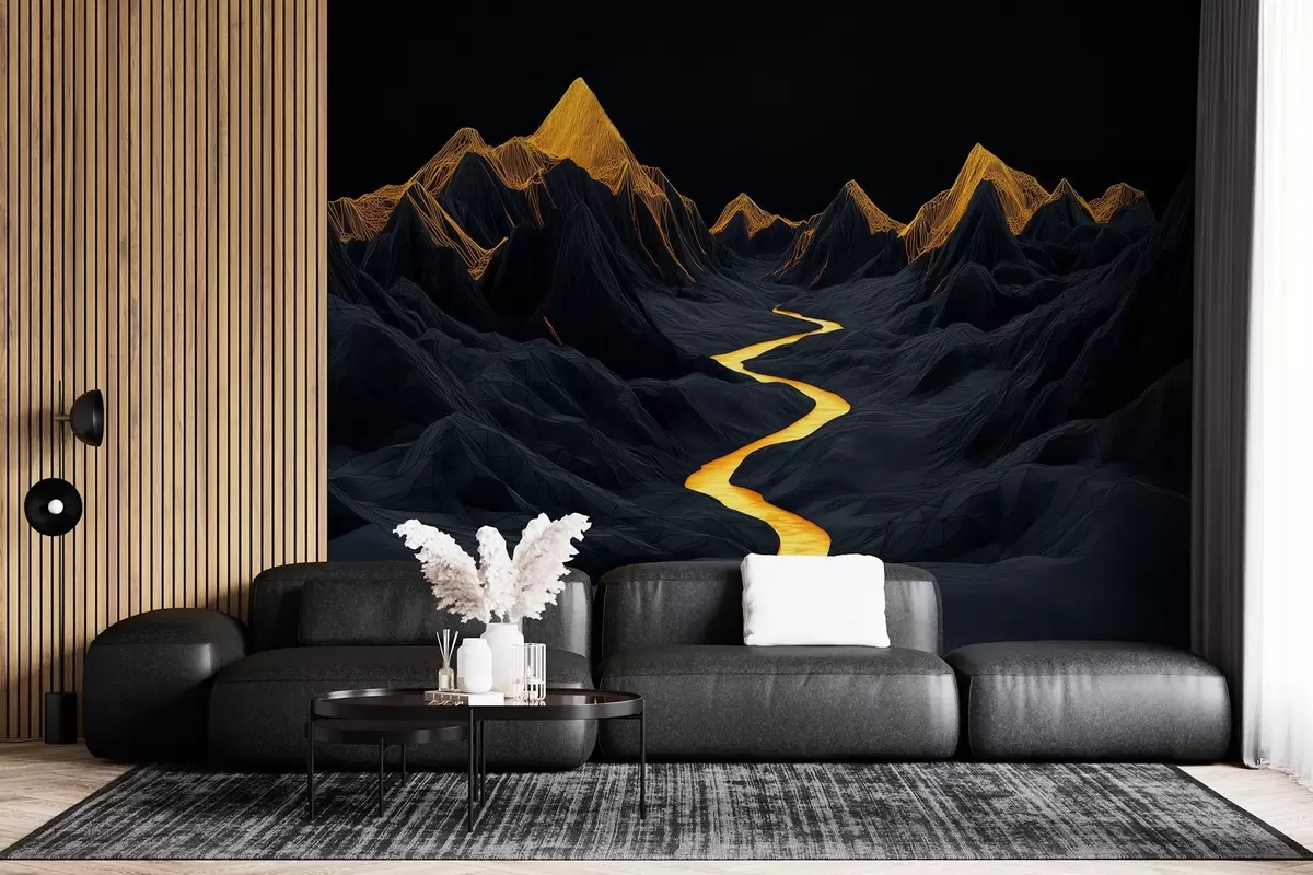 Fototapeedid Polügonaalne must maastik ja jõgi mägede vahel Nr w02063