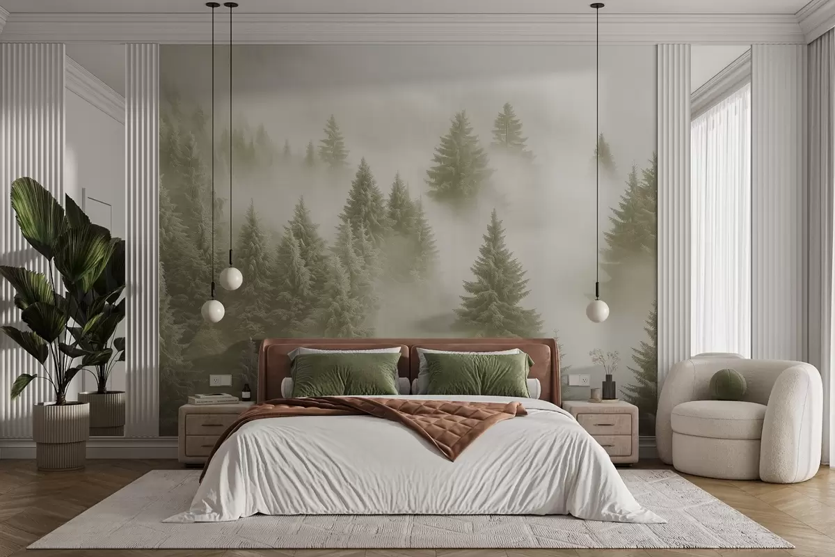 Fototapeedid Paks udu, mis ümbritses lumehommikuse metsa pehmete roheliste toonidega Nr w02064v2