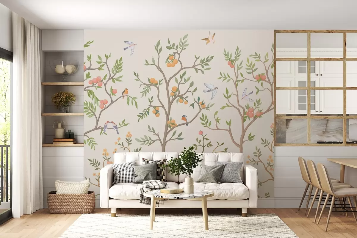 Fototapeedid Chinoiserie kujundus lindude, mähisevate puude, puuviljade ja lilledega Nr w02128