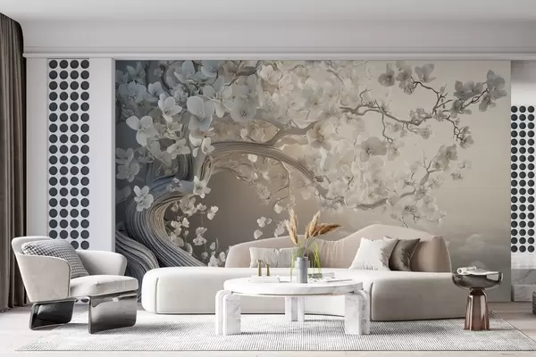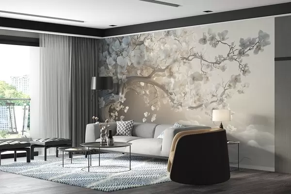 Fototapeedid Võluv puu valgete lilledega pilvede taustal huvitavas stiilis ja õrnades soojades värvides Nr w02133