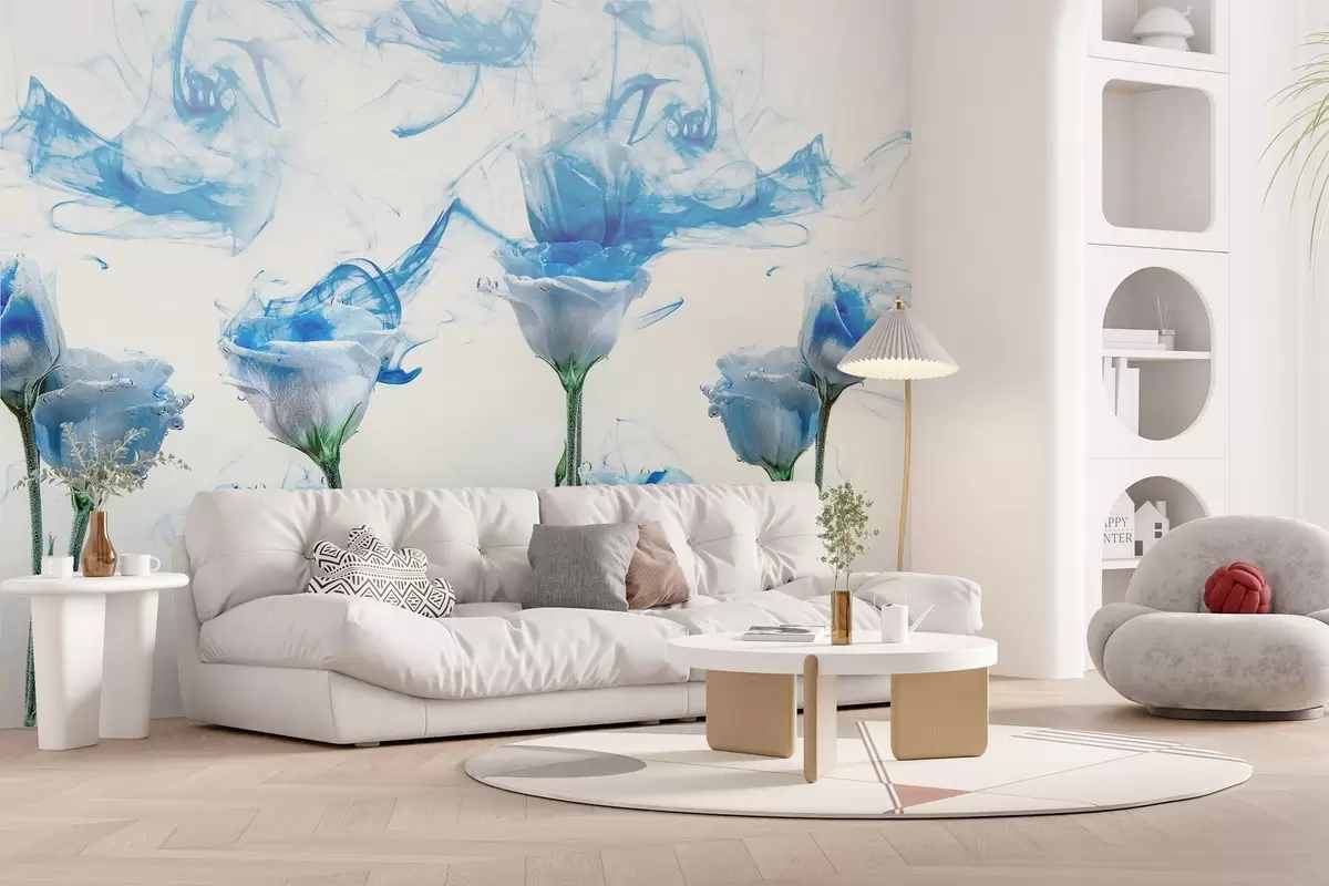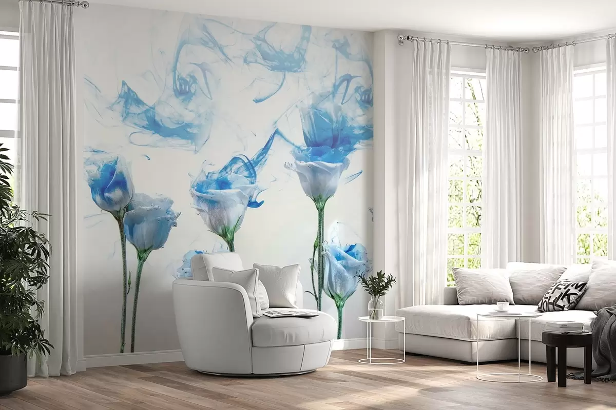 Fototapeedid Valged roosid vee all valgel taustal siniste akrüülvärvi triipudega. Nr w02139