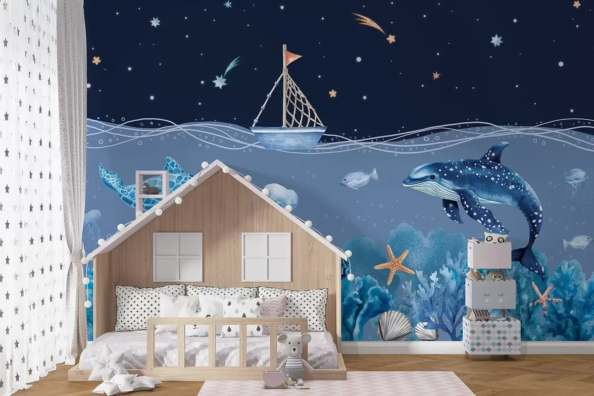 Fototapeedid Mereelu, akvarellistiil, korallid, paat, delfiin, meduusid, tähistaevas, sinised värvid Nr w02310