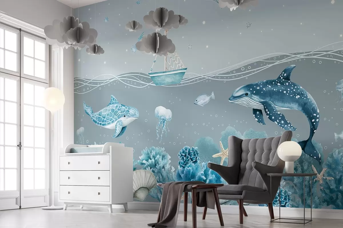 Fototapeedid Mereelu, akvarellistiil, korallid, paat, delfiin, meduusid, tähistaevas, pehmed sinised värvid Nr w02310v3