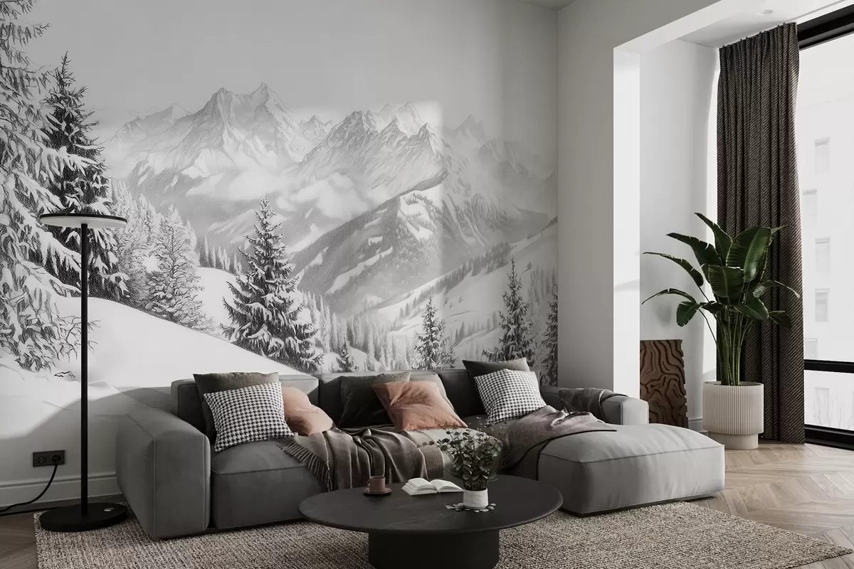 Fototapeedid Talv mägedes, mets, Alpid, pliiatsiga joonistamine, loodusmaastikud Nr w02353