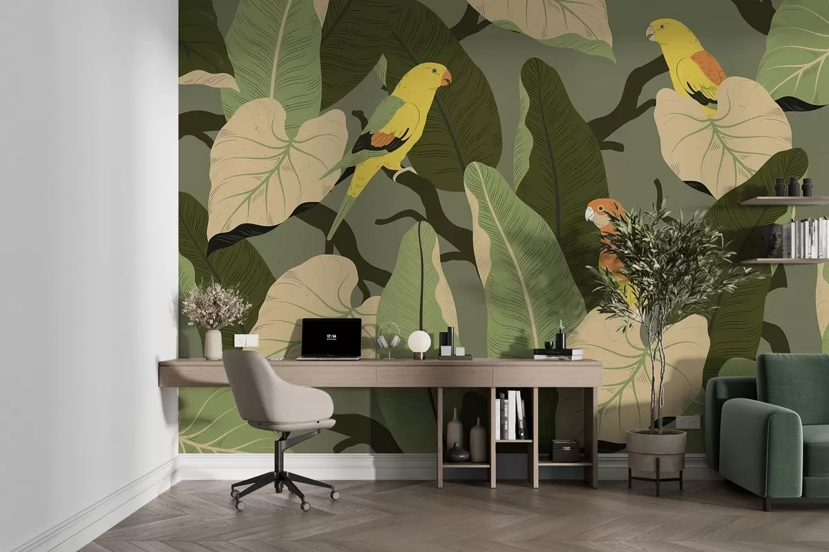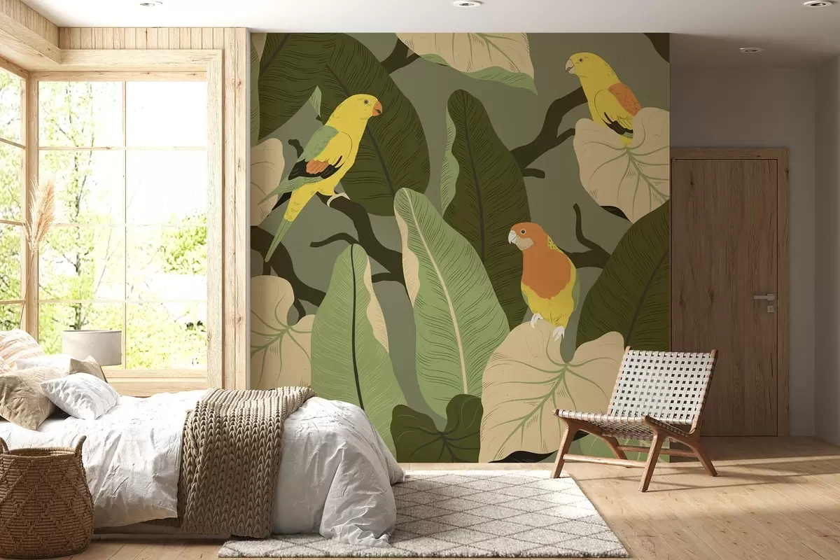 Fototapeedid troopilised lehed koos papagoidega Nr w02402