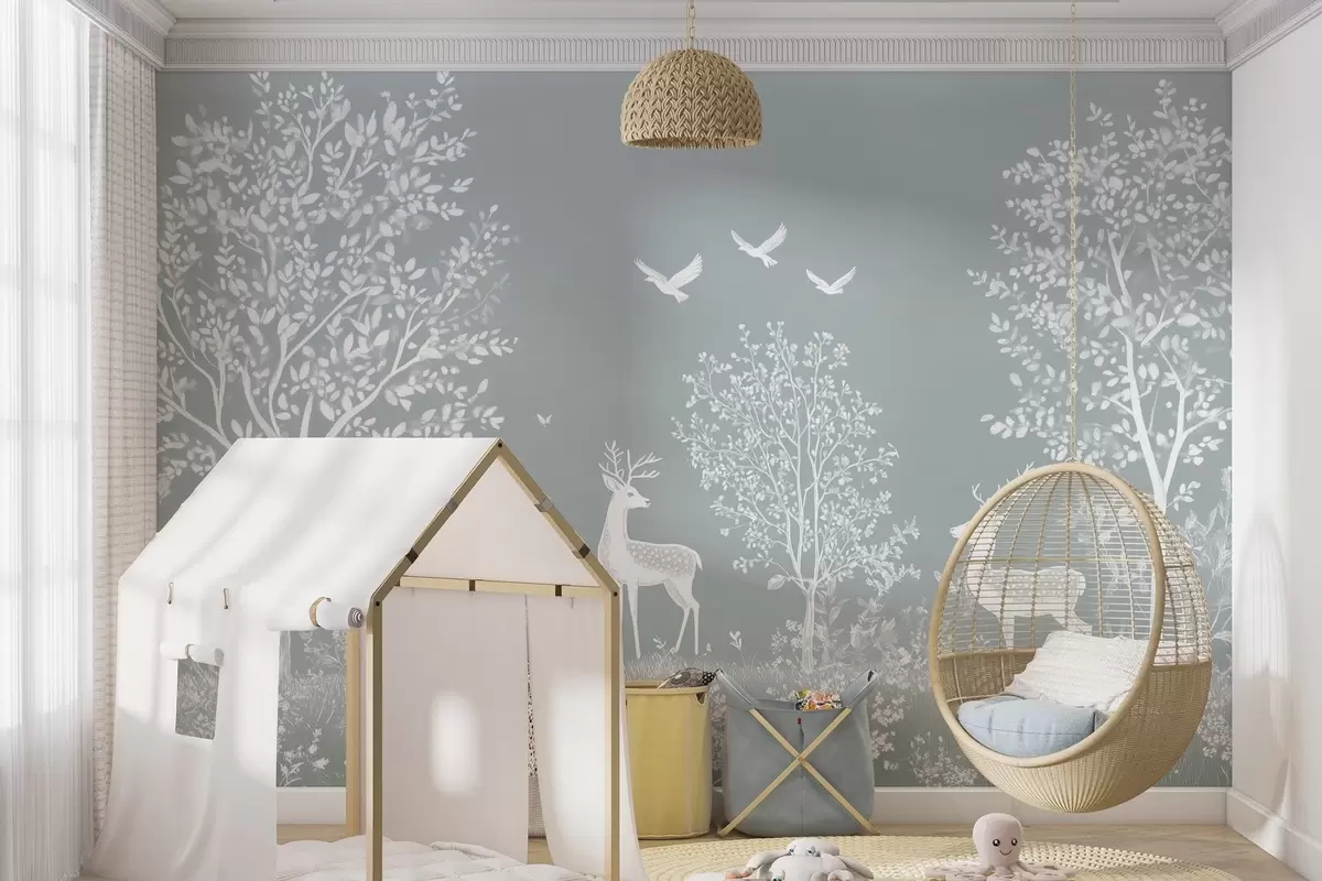 Fototapeedid mets koos hirvedega kriidijoonistuse stiilis hallil taustal Nr w02444v2