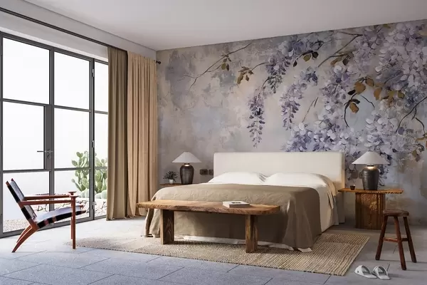 Fototapeedid pehmete, vaiksete värvidega tekstuurne tapeet, millel on õrnad lehvikute lilled ja oksad. Nr w02451