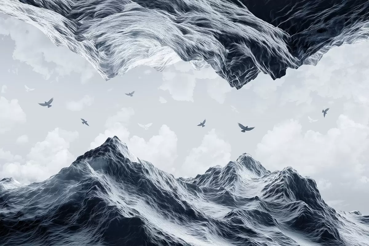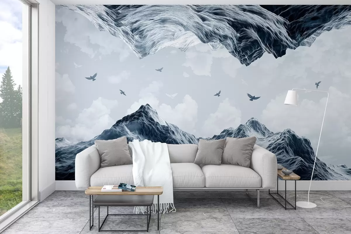Fototapeedid Mäed, maastik, realism, lendavad linnud, loodus, pilved, sinised värvid Nr w02514v1