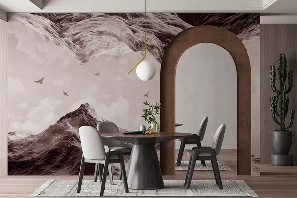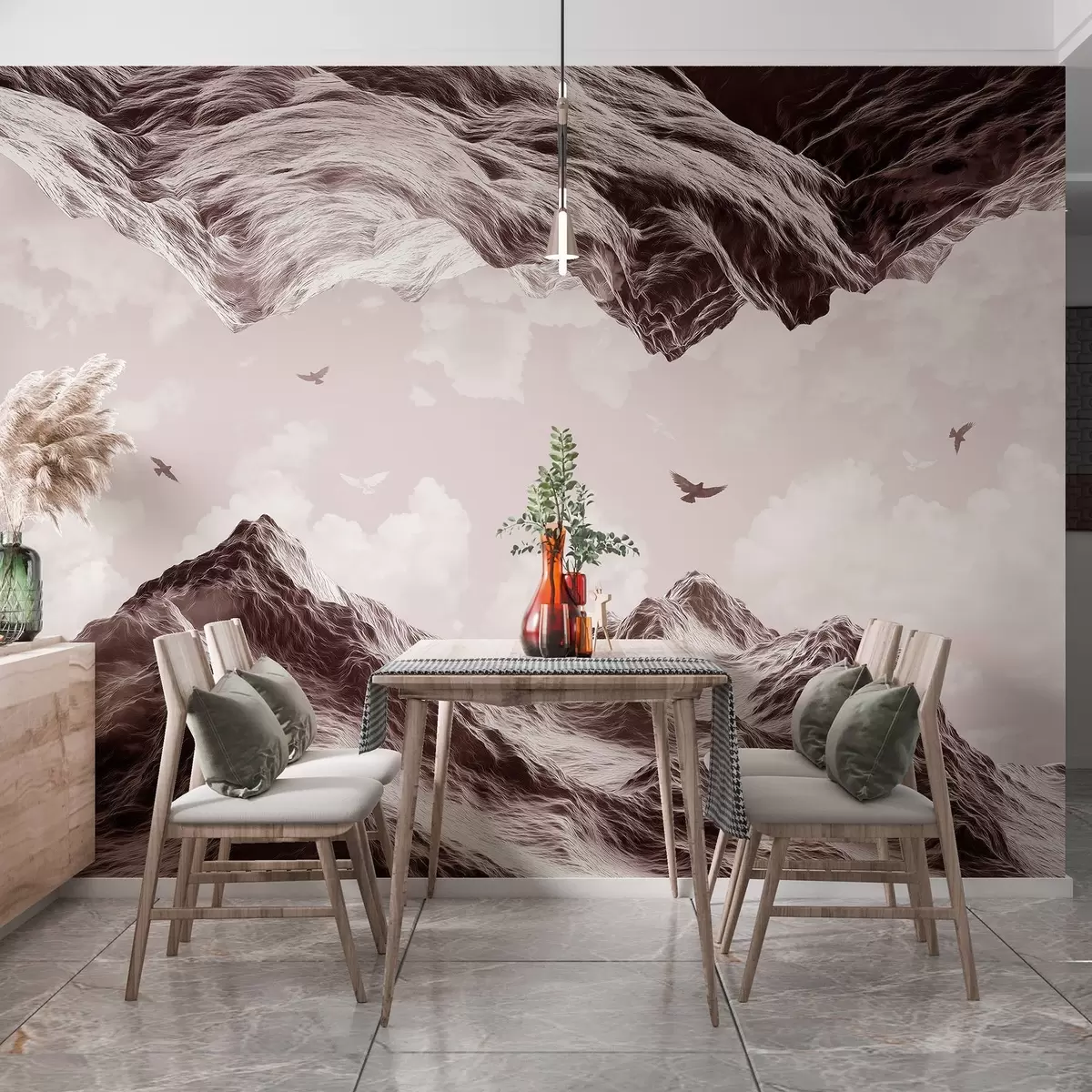 Fototapeedid Mäed, maastik, realism, lendavad linnud, loodus, pilved, pruunid värvid Nr w02514v2