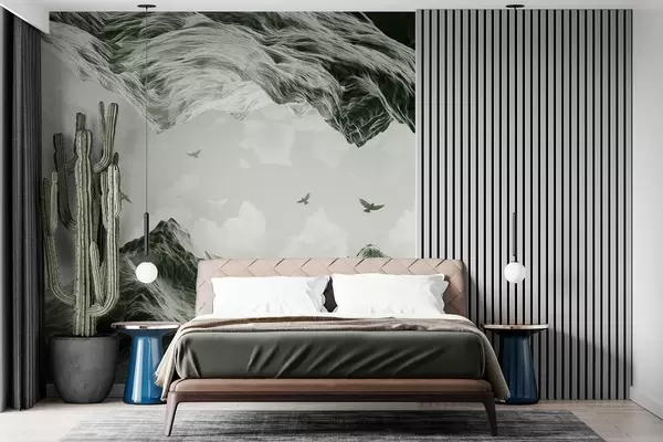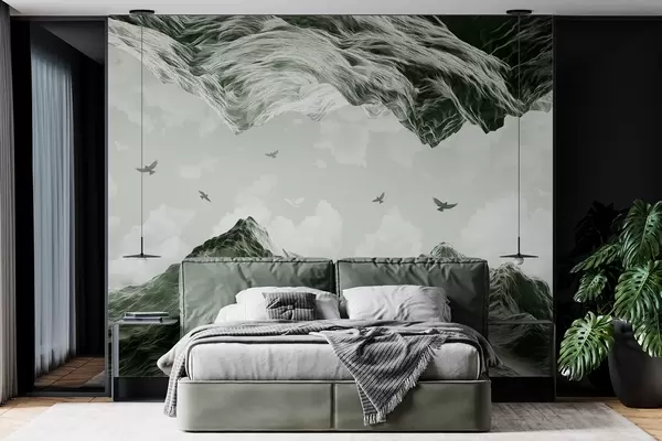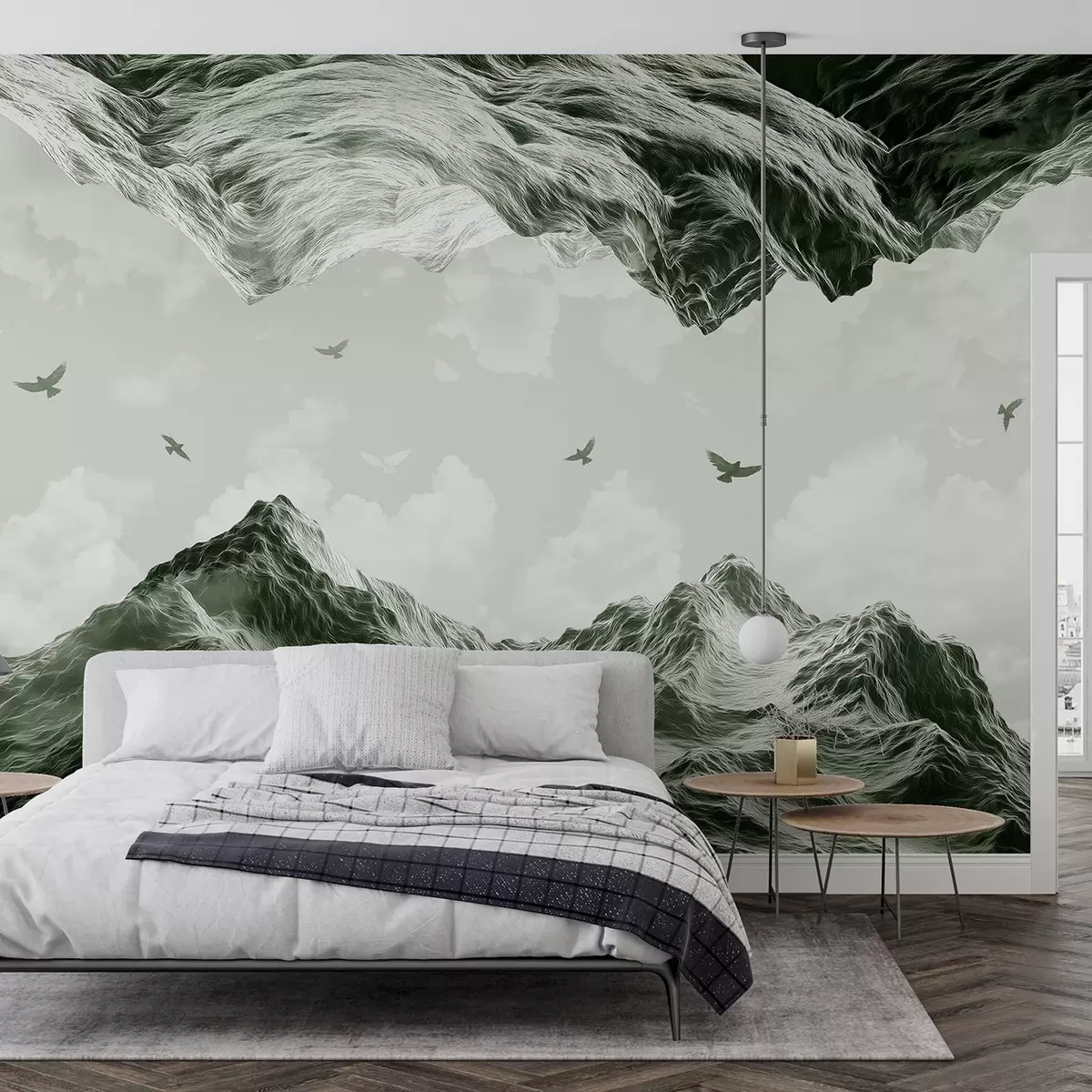 Fototapeedid Mäed, maastik, realism, lendavad linnud, loodus, pilved, rohelised värvid Nr w02514v3