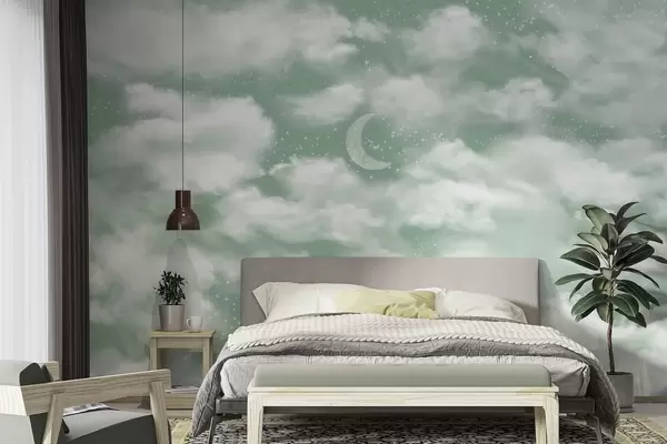 Fototapeedid Tähtede taevas koos kuu ja pilvedega, unenäoline, eeterlik, pehmed rohelised värvid Nr w02515v2
