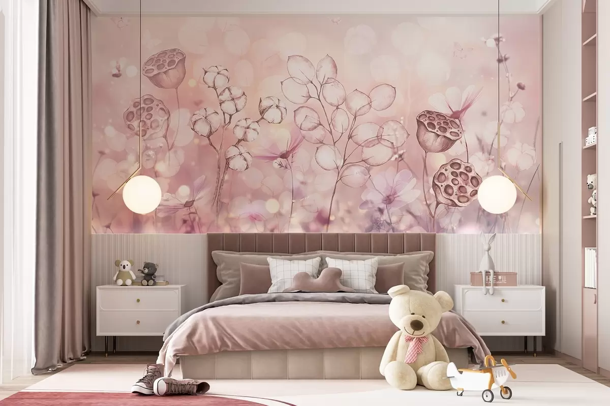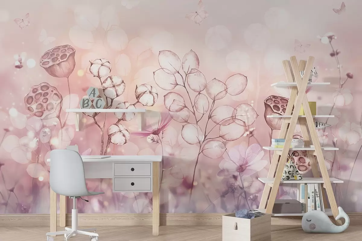Fototapeedid Unenäoline lilleaed, liblikas, puuvillased lilled, lootosid, roosad värvid Nr w02516