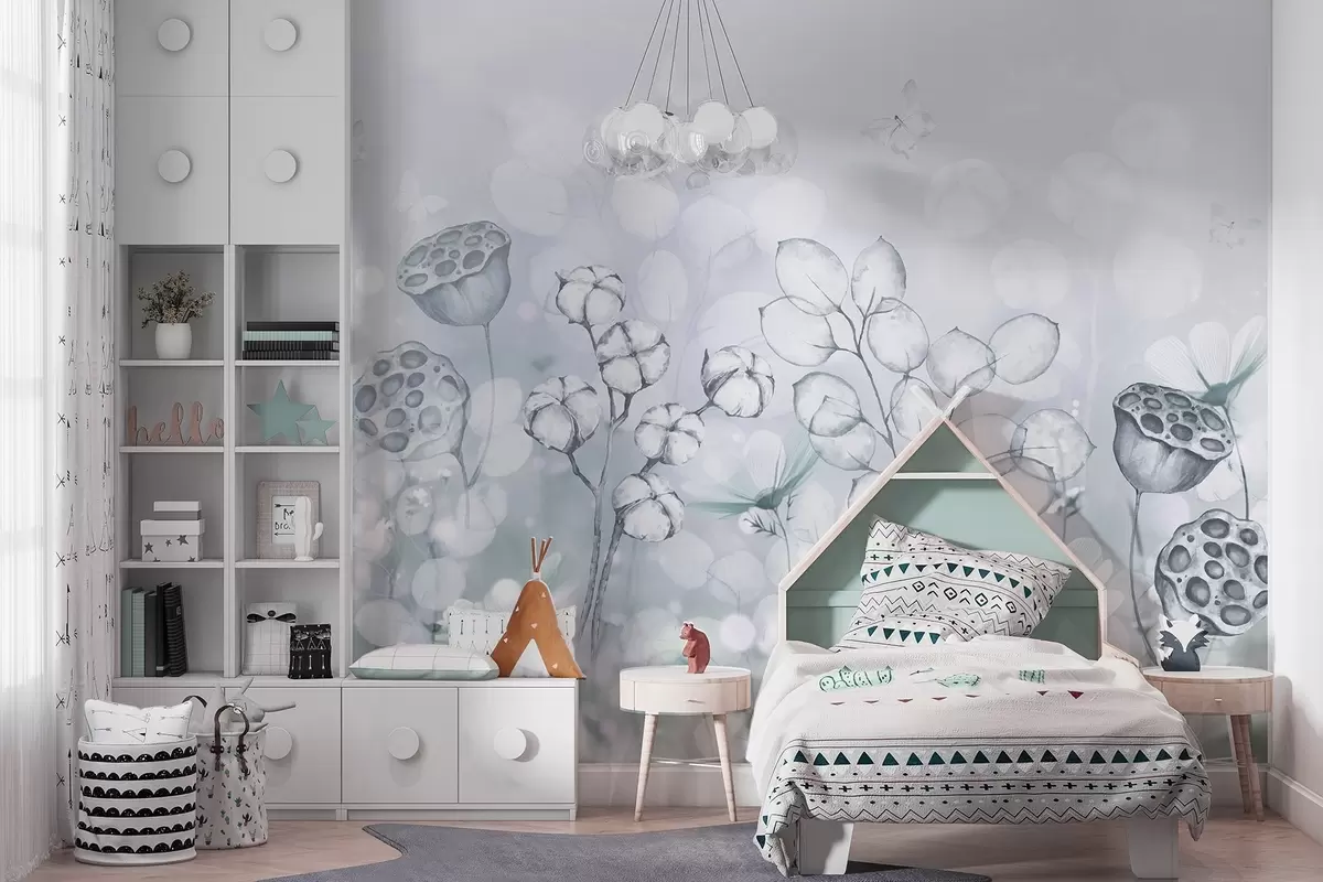 Fototapeedid Unenäoline lilleaed, liblikas, puuvillased lilled, lootosid, hallid värvid Nr w02516v2