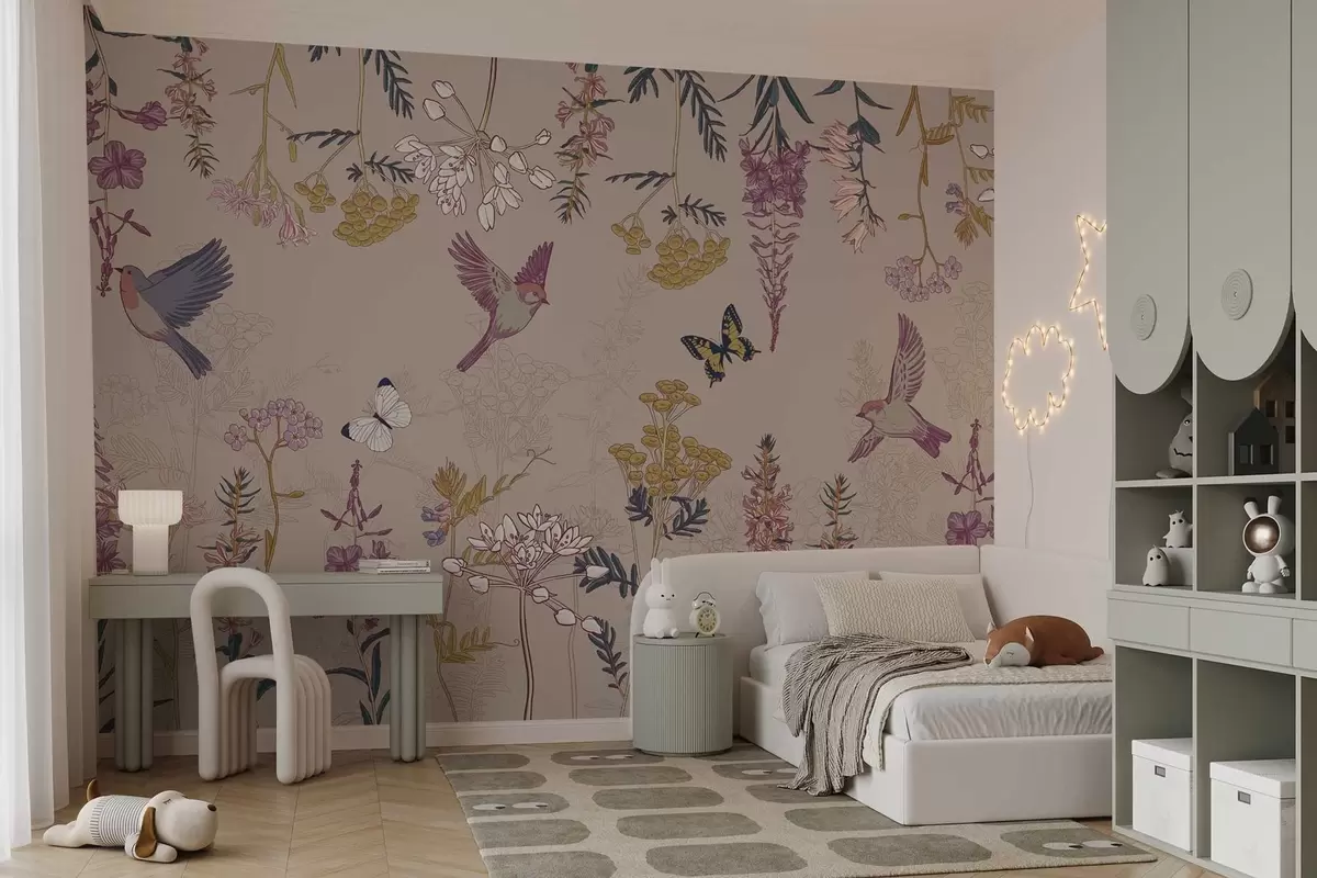 Fototapeedid metsalillede ja lindude ansambel beežil taustal Nr w02634