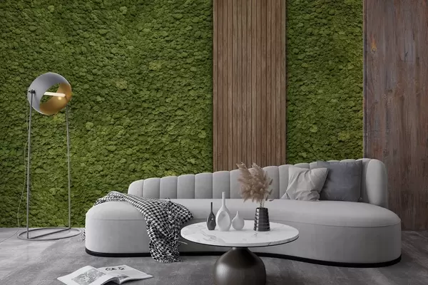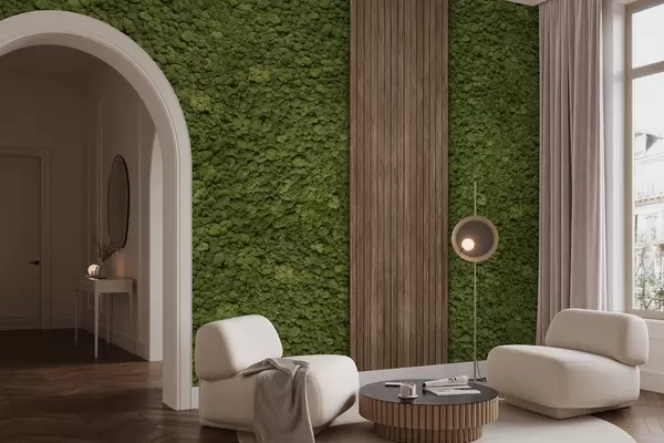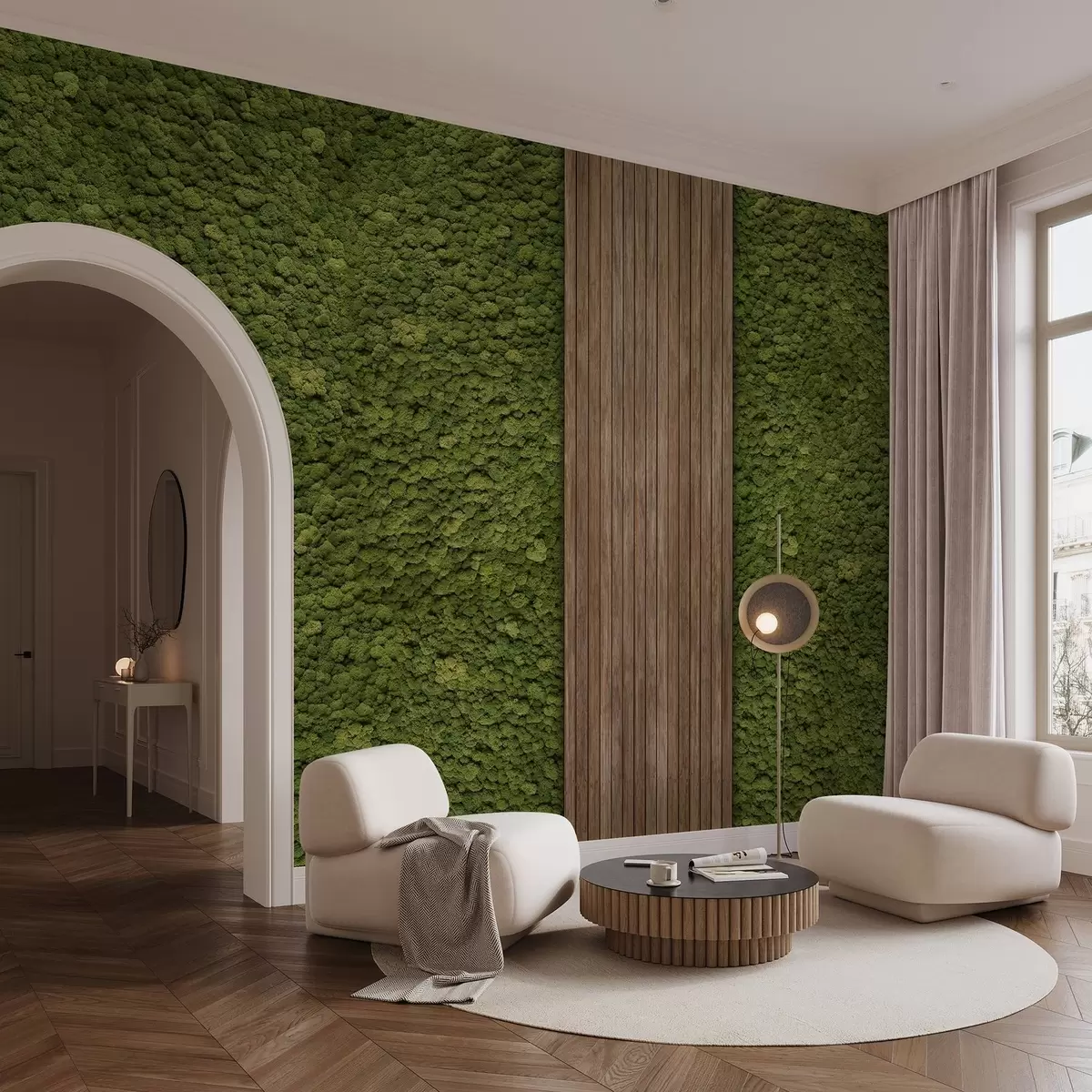 Fototapeedid Sammalstiilis sein puidust paneeliga, lopsakad oliivivärvid Nr w02656v3