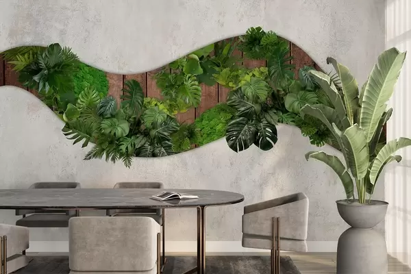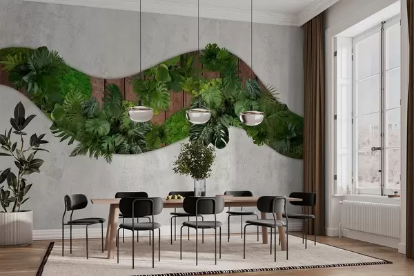 Fototapeedid Taimede, sambla, palmilehtedega seinakaunistus, puidust taustaga Nr w02658