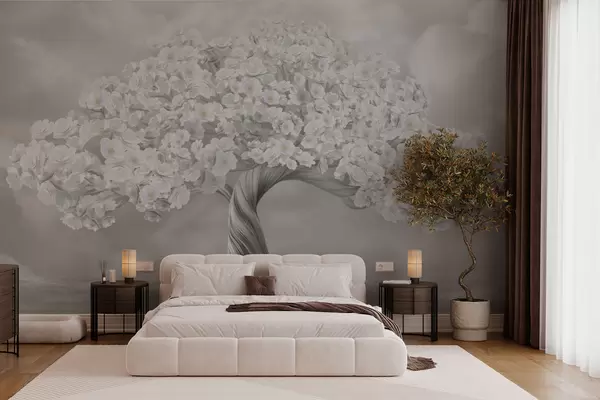 Fototapeedid Suur puu lilledega koos pilvedega taustal pastelsetes värvides w02748v1