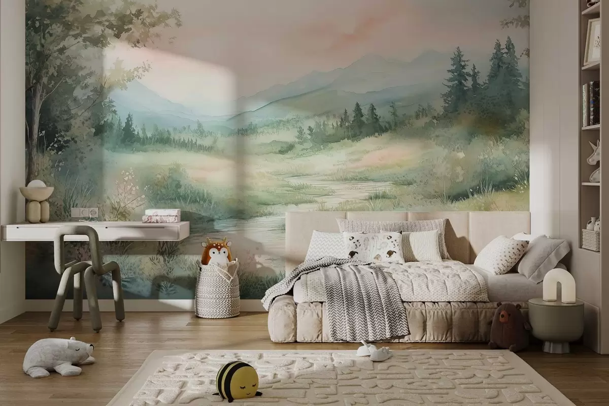 Fototapeedid akvarellmaastik koos tee ja mägedega Nr w02764