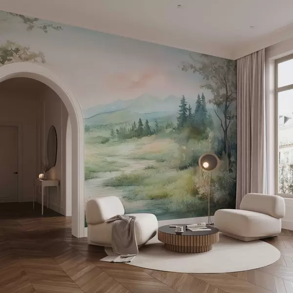 Fototapeedid akvarellmaastik koos tee ja mägedega Nr w02764