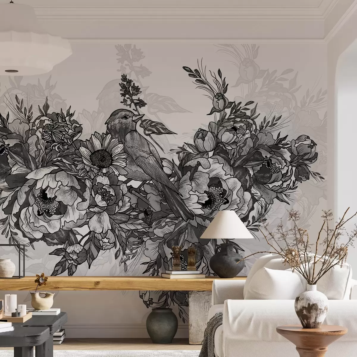 Fototapeedid Ühevärviline lille- ja linnukompositsioon Nr w02834