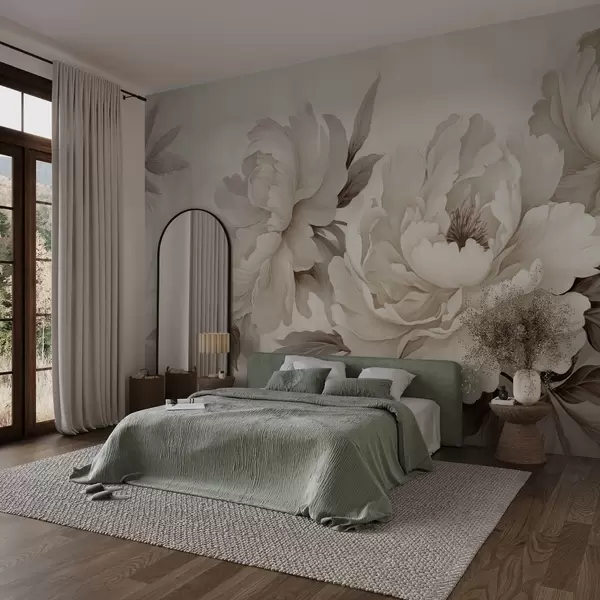 Fototapeedid Kreemjas beežis toonides õrnad pioonid, millel on rafineeritud üksikasjad kroonlehtede ja lehtedega, mis loovad sooja ja rafineeritud atmosfääri Nr w02856v1