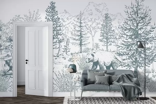 Fototapeedid Metsaelu, puud, metsloomad, karu, rebane, öökull, põõsad, pliiatsiga joonistus, sinised värvid Nr w02929v1