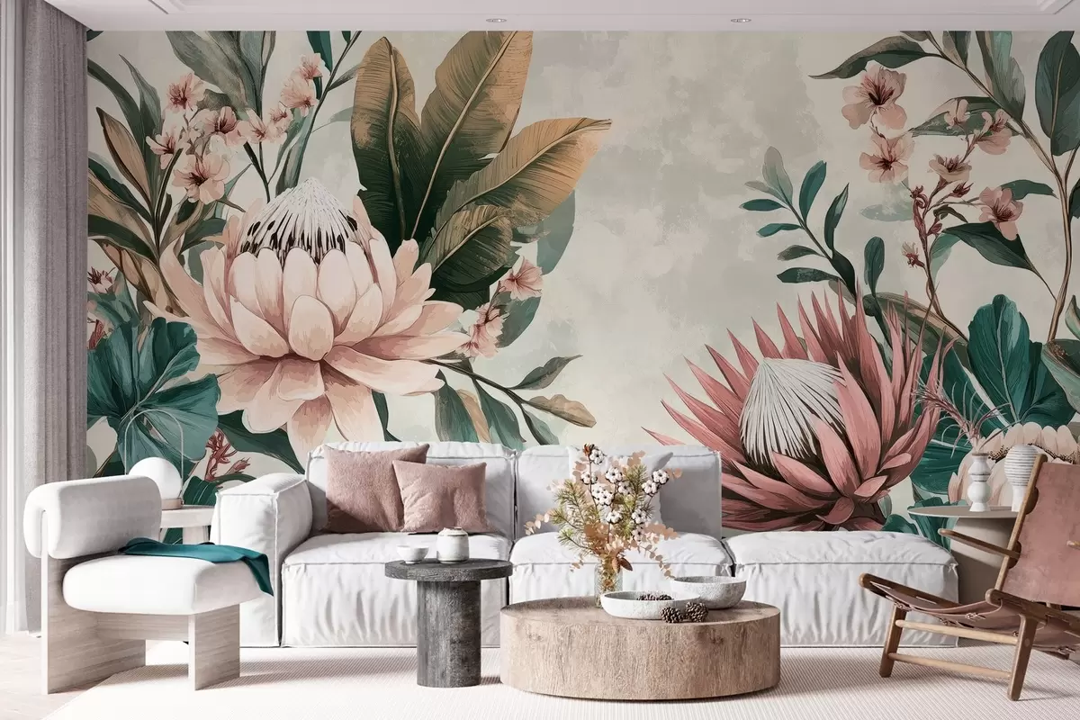 Fototapeedid eksootilised taimed, palmilehed ja protea lilled, mis on inspireeritud vintage'ist Nr w03015