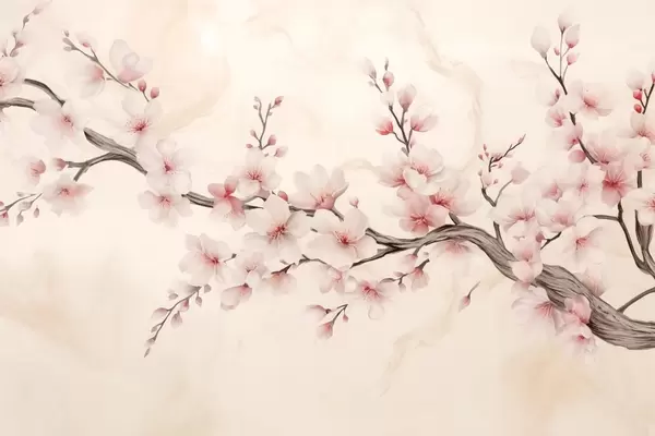 Fototapeedid Õrn kirsiõie okas koos pehmete roosade õitega heledal taustal Nr w03079