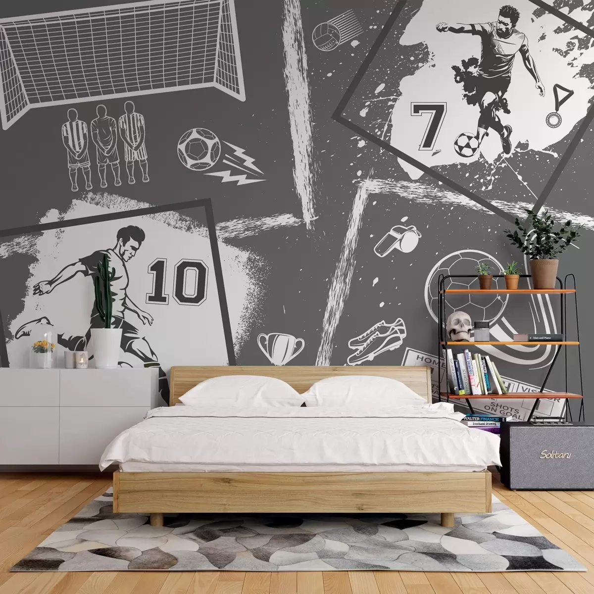 Fototapeedid Jalgpallurid, pall ja muud jalgpalliatribuudid halli toonides Nr w03122v1