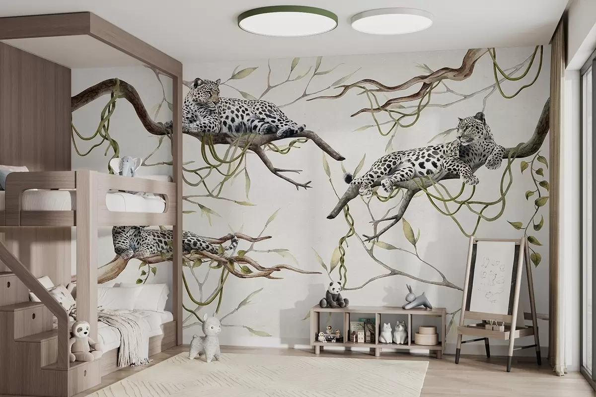 Fototapeedid Leopardid džunglipuudel, liaanid, troopilised, metsloomad, pastelne värvipalett Nr w03146v4