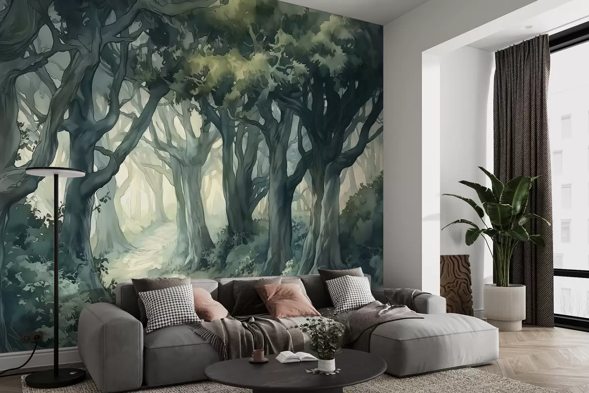 Fototapeedid Suurte puudega mets, roheline värvispallete, akvarellistiilis joonistus Nr w03150