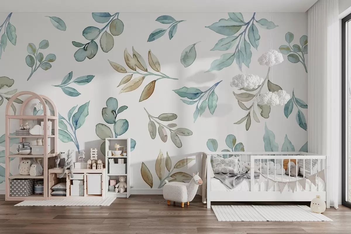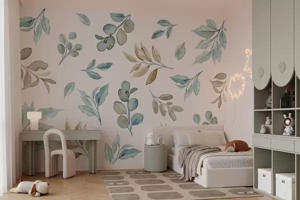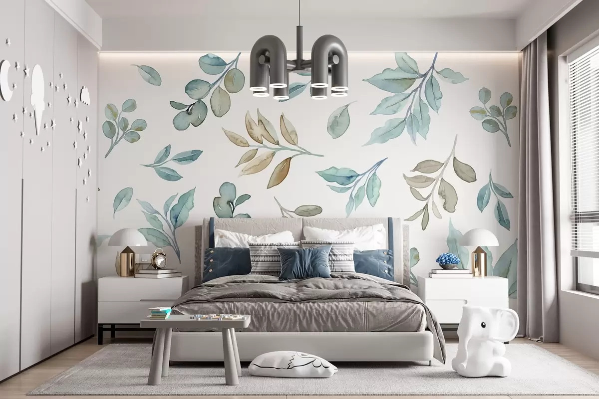 Fototapeedid erinevad lehed ja oksad akvarellitehnikas sinistes ja beežides toonides valgel taustal Nr w03280