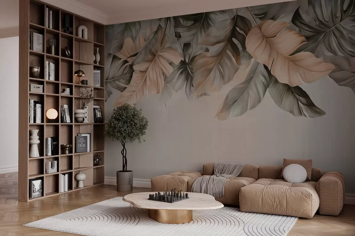 Fototapeedid Ülalt rippuvad troopilised lehed tekstuurilisel taustal Nr w03290
