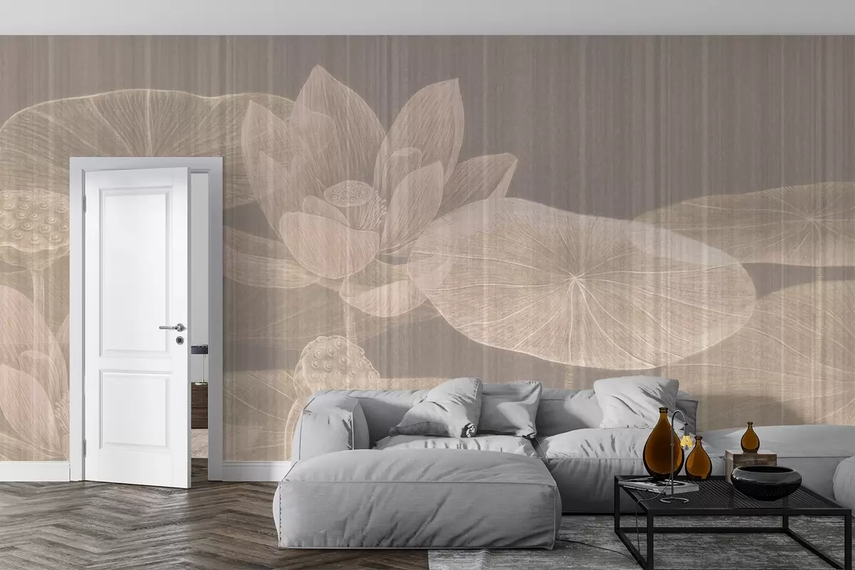 Fototapeedid Elegantne illustratsioon lootosidest ja lillelilledest pastelsetes toonides, millel on tekstuurne linasefekt, Nr w03324v1