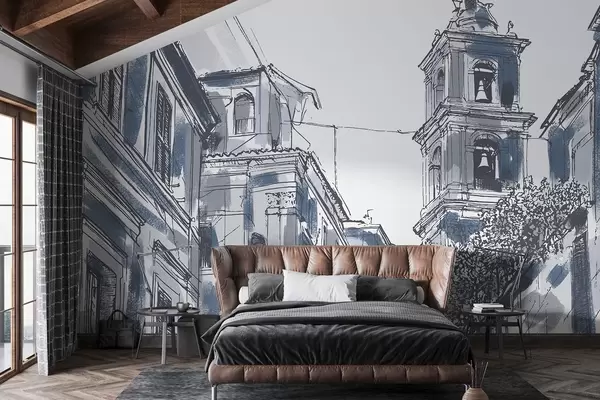 Fototapeedid Vahemere linna tänav, kabel, arhitektuur, hallid ja sinised värvid Nr w03350