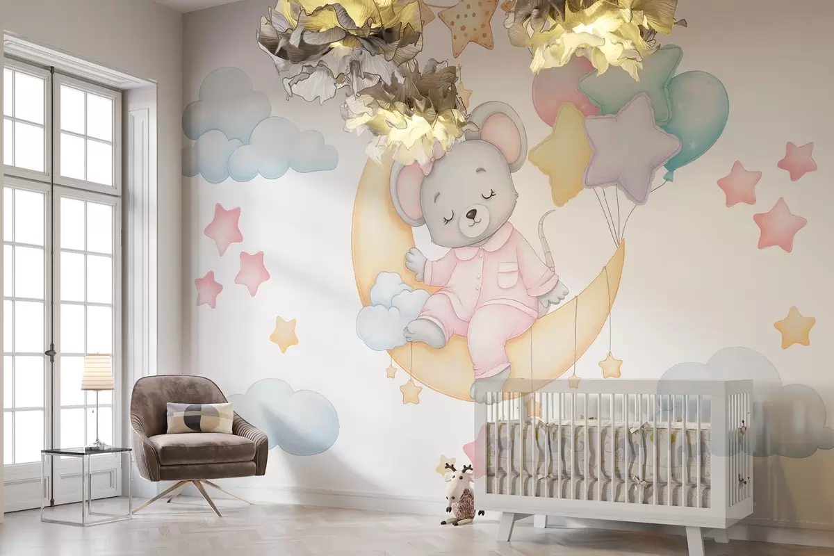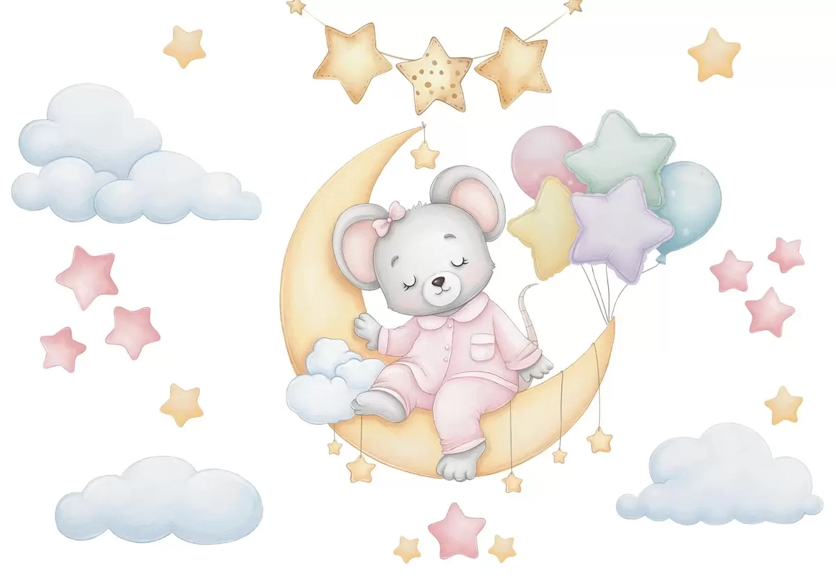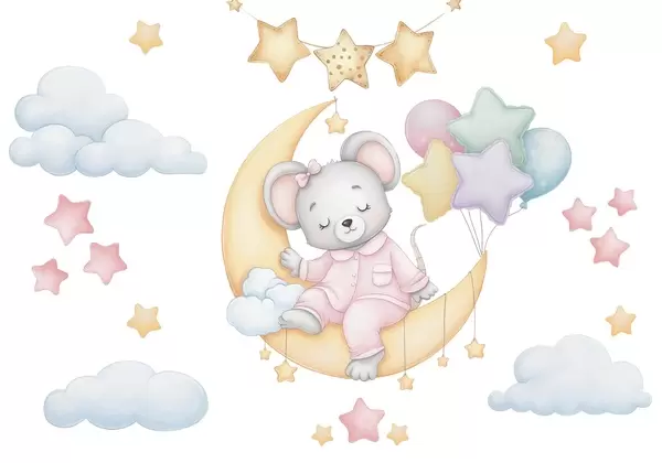 Fototapeedid Armas illustratsioon magavast väikesest hiirest kuuvalgel, mida ümbritsevad tähed, pilved ja õhupallid Nr w03380