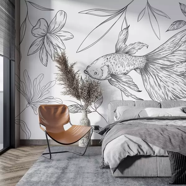 Fototapeedid Joonistus kala lilledega, minimalism, mere, lilleline, tindistiil, tindiga Nr w03516