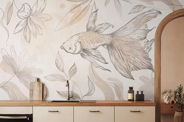 Fototapeedid Kala koos lilleelementidega, beeži taustaga, jooneline joonistus Nr w03517