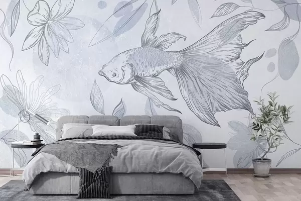 Fototapeedid Kala koos lilleelementidega, sinisel taustal, jooneline joonistus Nr w03517v2