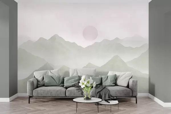Fototapeedid Boho stiilis mägede maastik, päikeseloojang, pehme pastell, roheline Nr w03547