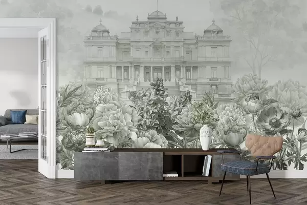 Fototapeedid Kuninglik palee koos pojengiga, akvarellistiil, loodus, rohelised värvid, boho Nr w03552v2