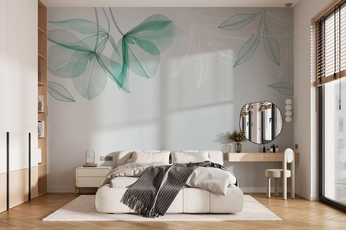 Fototapeedid õrnad poolläbipaistvad rohelistes toonides lilled ja lehed Nr w03616v1