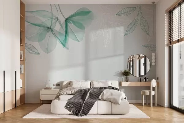 Fototapeedid õrnad poolläbipaistvad rohelistes toonides lilled ja lehed Nr w03616v1