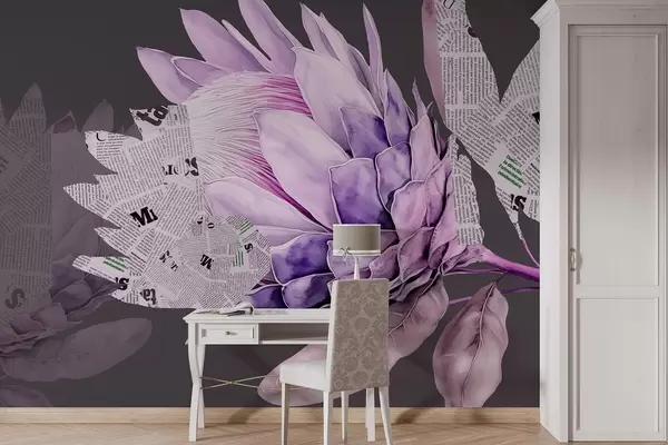 Fototapeedid Protea lilled, ajalehe kunst, lilleline, troopiline, tume taust, lillad värvid Nr w03667v2