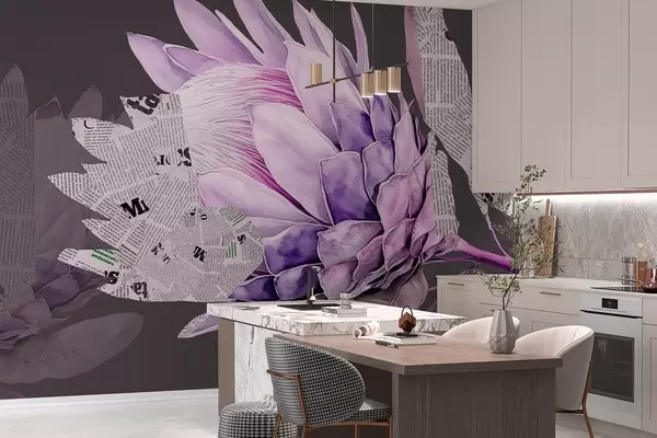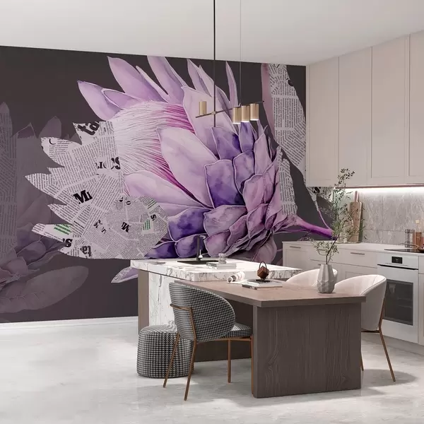 Fototapeedid Protea lilled, ajalehe kunst, lilleline, troopiline, tume taust, lillad värvid Nr w03667v2